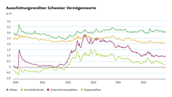 Interessanter sind aus unserer Sicht Realwerte wie Schweizer Immobilienfonds, vor allem wegen deren Ausschüttungsrenditen. Nennenswerte Kapitalgewinne sollte man wegen der hohen Bewertungen aber nicht erwarten. Eine grössere Kurskorrektur, z.B. aufgrund steigender Zinsen oder fallender Immobilienpreise, ist aus unserer Sicht aber unwahrscheinlich. Schweizer Aktien schliesslich dürften nach einem positiven 2025 ein weiteres gutes Jahr vor sich haben. Der Markt ist im historischen und internationalen Vergleich moderat bewertet, die Aussichten für das Gewinnwachstum der Unternehmen sind intakt und die Erwartungen daran nicht überrissen hoch.