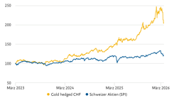 In den vergangenen drei Jahren ist der Goldpreis stark gestiegen und hat Anlegerinnen und Anlegern, die Gold im Portfolio hatten, einen schönen Vermögenszuwachs beschert. Gold war eine der Anlageklassen mit der besten Performance. Wie Abbildung 1 zeigt, hat es trotz der jüngsten Korrektur deutlich besser abgeschnitten als beispielsweise Schweizer Aktien.