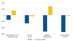Gold gilt aufgrund seiner Seltenheit, Beständigkeit und Unvermehrbarkeit seit jeher als verlässliches Wertaufbewahrungsmittel. Im Gegensatz zu Papiergeld, das durch Inflation an Kaufkraft verlieren kann, bietet Gold langfristigen Schutz vor Entwertung. Gleichzeitig fungiert Gold als Krisenschutz. Kommt es an den Finanzmärkten zu Turbulenzen, steigt in der Regel die Unsicherheit und Angst bei den Anlegerinnen und Anlegern, was zu erhöhter Nachfrage nach sicheren Häfen führt. Während andere Anlagen in solchen Phasen oft unter Druck geraten, bleibt Gold meist stabil oder gewinnt sogar an Wert. Dieser Diversifikationseffekt macht das Edelmetall zu einer attraktiven Beimischung im Portfolio. Wie Abbildung 2 zeigt, hat Gold bei grösseren Aktienmarktkorrekturen häufig einen wirksamen Schutzbeitrag geleistet.